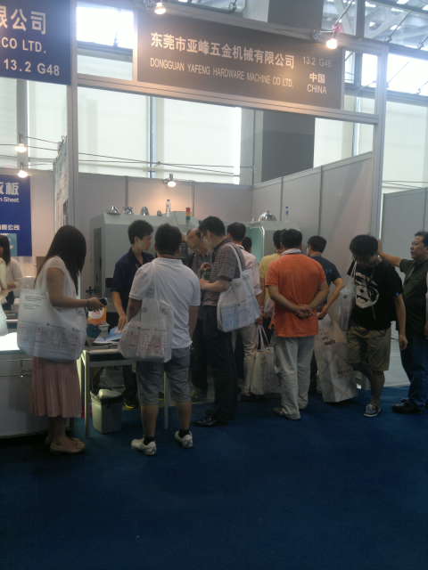 公司參加廣交會(huì)展位,面積有50個(gè)平方,如上圖,人潮赴涌過(guò)來(lái)。共展示亞峰機(jī)械的主打產(chǎn)品:如5臺(tái)數(shù)控旋壓機(jī)機(jī)器,3臺(tái)滾牙機(jī)產(chǎn)品,多種拋光機(jī)產(chǎn)品,6種核心切管機(jī)產(chǎn)品!也在現(xiàn)場(chǎng)演示加工設(shè)備,許多知名品牌的小配件都是由本公司的機(jī)器創(chuàng)造的。
